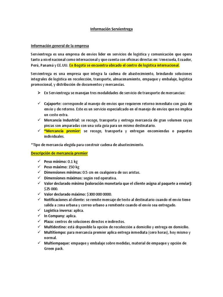 Centro comercial mamonal plaza crr 55 di cartagena fajobe sa cll 7a # 459 cucuta agencia neiva calle 10 # 7 52 local 8 neiva fajobe sa cll 17 # 17 pasto sucvalledupar calle 16 # 718 edificio pumarejo cotes of 310 valledupar agencia villavicencio calle 38 # 30a 64 centro edif davivien villavicencio sucla dorada. PROPUESTA PARA DISMINUIR LA TASA DE DEVOLUCIONES EN EL CENTRO LOGISTICO DE ALMACENAMIENTO DE SERVIENTREGA CSAR ARMANDO ROMERO HERNÁNDEZ NESTOR ALBERTO NIETO LARA CORPORACIÓN UNIVERSITARIA MINUTO DE DIOS centro de almacenamiento de Servientrega 28 321 Consecución de la información 28. Aug 12, 16La empresa colombiana de mensajería expresa, Servientrega, estrena en la ciudad de Miami su centro internacional logístico, una moderna plataforma con más de 10 metros cuadrados en donde se.