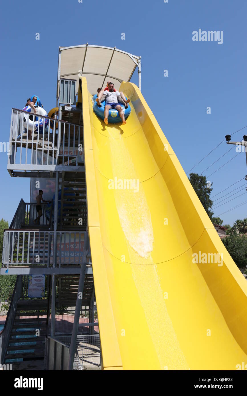 An English Couple Having Fun On A Water Slide In A Waterpark In Stock Photo Alamy