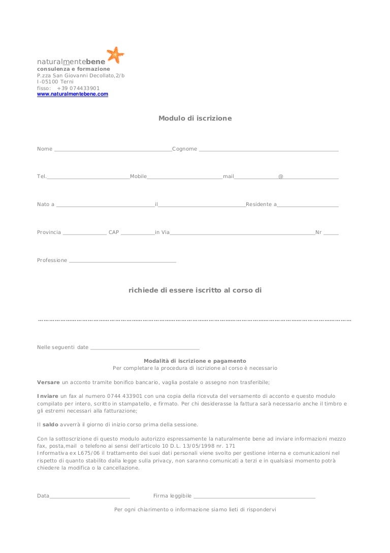 Modulo d’iscrizione Per iscriverti ai nostri corsi, è sufficiente inviare alla segreteria di Romanica 1 il modulo di iscrizione compilato 2 un anticipo di euro 150 Il versamento di euro 150 necessario per la prenotazione del corso può essere effettuato tramite. Progetta il modulo d'iscrizione alla mailing list Crea moduli d'iscrizione professionali nel giro di qualche minuto utilizzando l'editor di moduli "drag & drop"!. Modulo di iscrizione Adolescenze in sospeso La resilienza di ragazze e ragazzi di fronte alla pandemia ed il ruolo delle istituzioni in EmiliaRomagna Data 19/11/ Ora Luogo evento su Teams Numero massimo di partecipanti 2 Ultimo giorno per iscriversi.