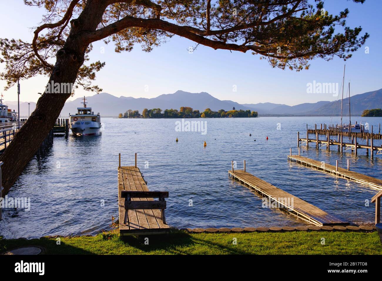 Alemania Baviera Gstadt Am Chiemsee Embarcaderos A Orillas Del Lago Chiemsee Con Fraueninsel En El Fondo Fotografia De Stock Alamy