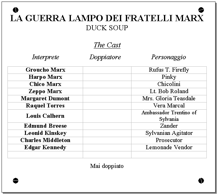 Cinema L'Aquila, Cinema Chieti, Cinema. Directed by Leo McCarey With Groucho Marx, Harpo Marx, Chico Marx, Zeppo Marx Rufus T Firefly is named president/dictator of bankrupt Freedonia and declares war on neighboring Sylvania over the love of wealthy Mrs Teasdale. Di ogni altra ci cattura in una sorta di malìa iconografica.
