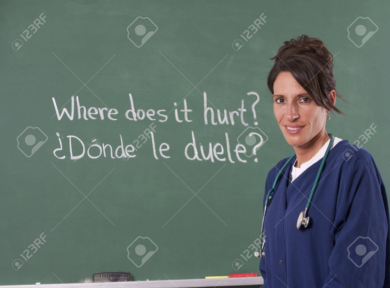 Immagini Stock Insegnante Di Nurse Traduce Dall Inglese Allo Spagnolo Sulla Lavagna Della Classe Il Fuoco E Il Maestro Image