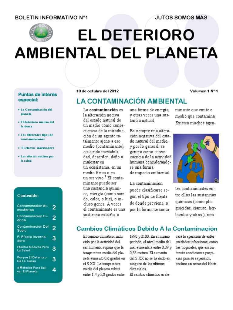 BOLETIN INFORMATIVO AMBIENTAL N° 14 UNIVERSIDAS LA CATOLICA Un estudio del Programa de las Naciones Unidas para el Medio Ambiente (PNUMA), publicado durante la Semana Internacional de Prevención de la Intoxicación por Plomo (organizada por la Alianza Mundial para Eliminar el Uso del Plomo en la Pintura), ha analizado pinturas. El compromiso con el medio ambiente, y el apoyo a la educación y la juventud reflejada en los más pequeños A esto se une que para Ecoembes, la sensibilización y la educación son claves, sobre todo entre los más pequeños Por esa razón pensamos que la orquesta era una buena y. Los defensores del medio ambiente estarán felices con esta plantilla que es de descarga gratuita Se diseñó específicamente para el movimiento medioambiental y es completamente personalizable utilizando InDesign 8 Plantillas gratuitas para boletín informativo editables en Word 10 Plantillas gratuitas para boletines informativos (Word).