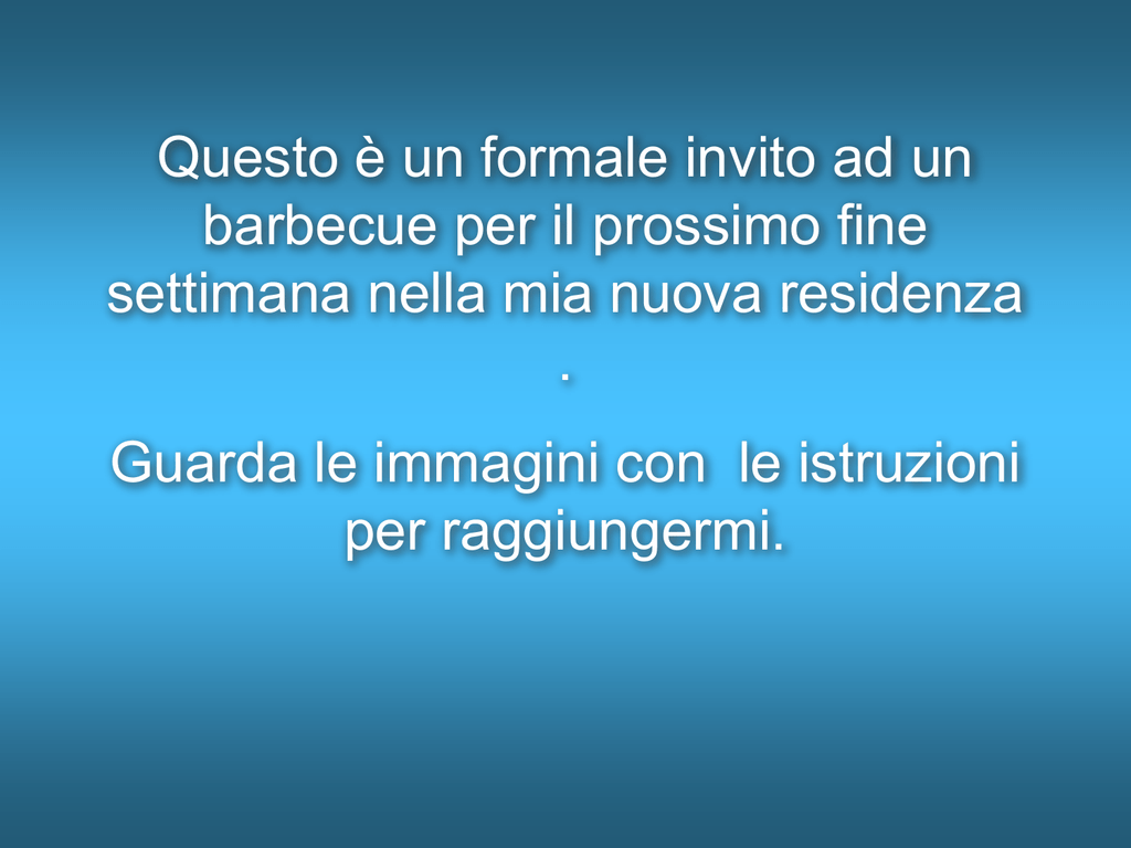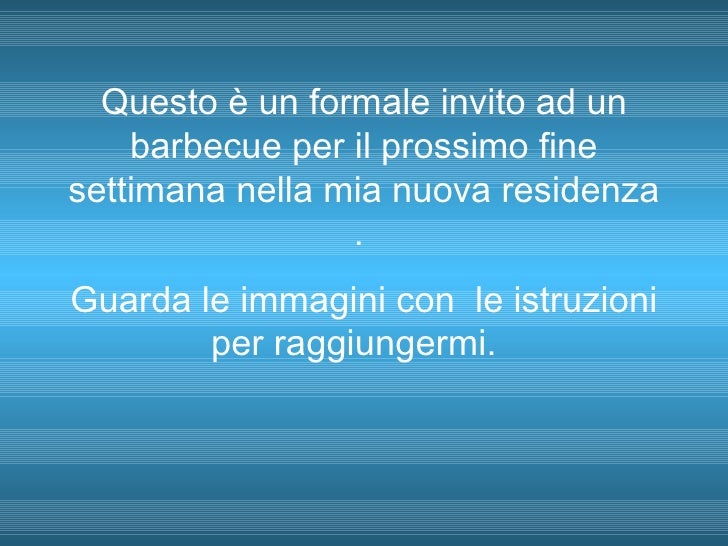 Invito Formale 1 Questo è un formale invito ad un barbecue per il prossimo fine settimana nella mia nuova residenza Guarda le immagini con le istruzioni per raggiungermi 2 Oceano Pacifico RESIDENZE OSPITI QUESTA E’ LA MIA CASA 3 SI ENTRA DA QUI Area riservata al Barbecue 4 E’ solo un piccolo posto rustico 5. A differenza dell'italiano formale, in cui spesso la grammatica richiede periodi molto lunghi, l'inglese è molto più sintetico prediligendo frasi brevi e con una struttura semplice Le formule di cortesia Nello scrivere la tua email non solo stai usando un'altra lingua, ma ti stai anche approcciando ad un’altra cultura che ha usi differenti. Tante sono le lettere di invito formale che si possono scrivere per realizzare un invito a un evento, ognuna con la sua singola identità che prevede un tono e un linguaggio ben specifico Le due proposte che seguono sono le classiche e potranno essere seguite o precedute da un testo creativo adatto al carattere dell'attività che intendi promuovere.