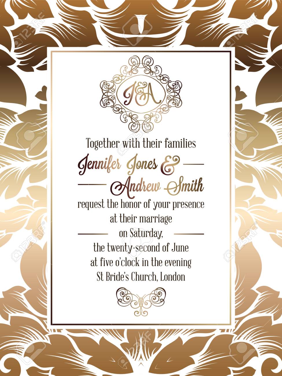 Vettoriale Modello Di Carta Di Invito Di Nozze Di Stile Barocco Dell Annata Elegante Disegno Formale Con Il Damasco Di Priorita Bassa Decorazione Tradizionale Per Il Wedding Oro Su Sfondo Bianco