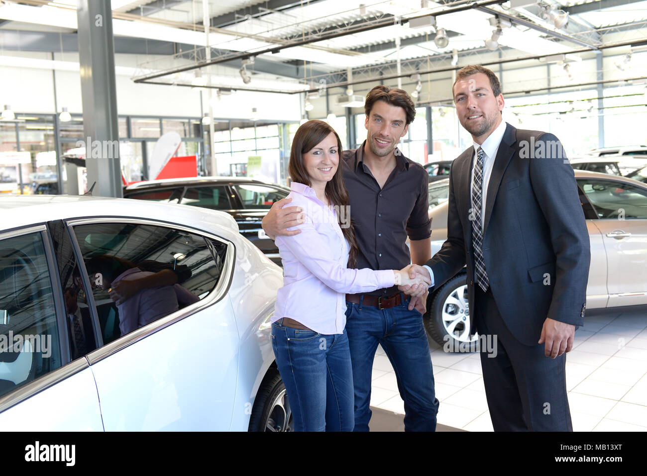 Gentile Venditore Auto Gesto Di Benvenuto Alla Concessionaria Auto Foto Stock Alamy