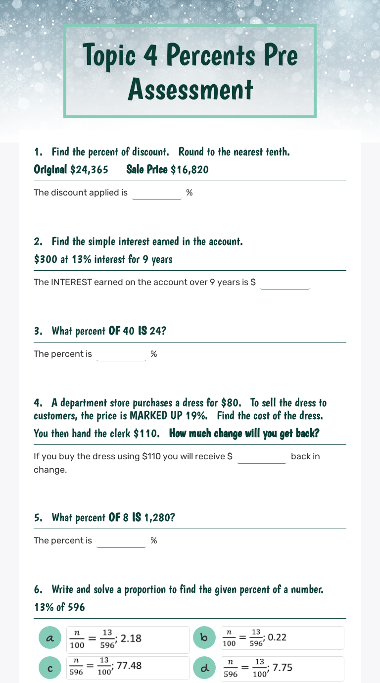 Topic 4 Percents Pre Assessment Interactive Worksheet By Jordan Neiding Wizer Me