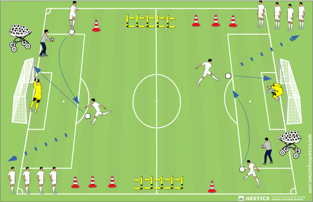 ALLENAMENTO DEI TIRI Esercizio di tiro in porta, un circuito integrato di 1 vs 1, 2 vs 2 e combinazioni di passaggi e finalizzazione in porta Un esercizio che allena diverse situazioni offensivi, come l’uno contro uno, che addestra la rapidità di guida palla, superamento avversario con dribbling e tiro in porta;. Esercizio semplice per allenare il tiro in porta Spesso in allenamento o nel riscaldamento prima di una partita si fanno fare i tiri in porta Proprio perché è un esercizio che viene svolto spesso volevo riproporlo sottolineando l'obiettivo principale che deve essere quello di motivare i giocatori in modo che abbiamo fiducia di fare goal se arriveranno a tirare all'interno dell'area. Dove La direzione del pallone dovrebbe essere una sola quella che inganna il portiere Se invece si considera la posizione di tiro, si possono avere tiri centrali (la scelta si basa su fattori quali posizione dell’estremo difensore, eventuali avversari in traiettoria, provenienza del pallone, ecc), o tiri da posizione laterale (ideale un tiro indirizzato verso il secondo palo, più.