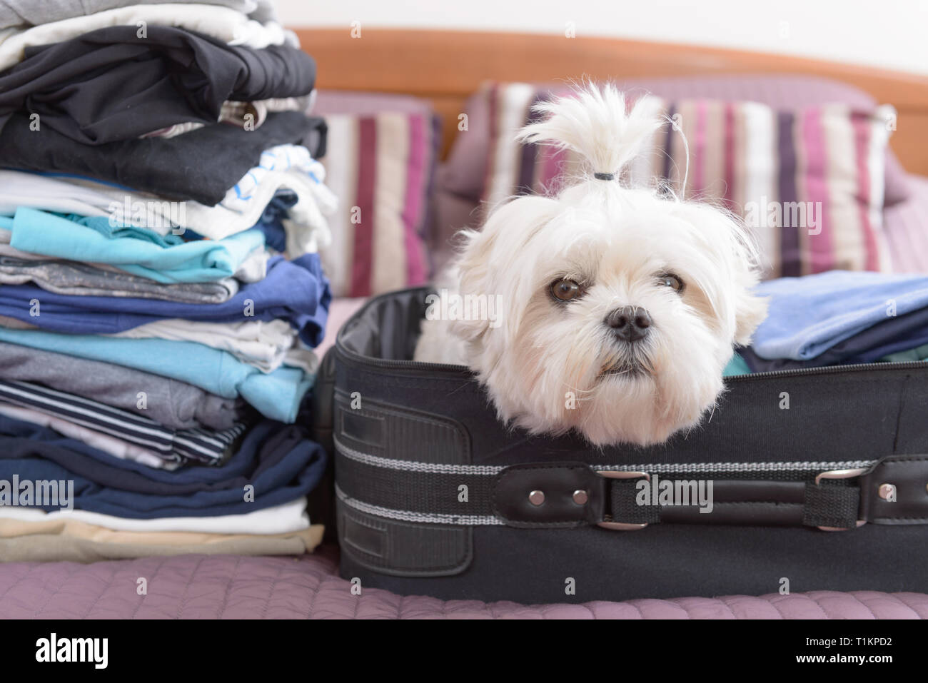 Piccolo Cane Maltese Seduto In Valigia O In Borsa E In Attesa Di Un Viaggio Foto Stock Alamy