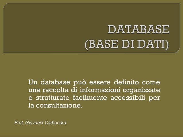 Indice dei contenuti delle lezioni videoregistrate. LE BASI DI DATI LE BASI DI DATI Prima di iniziare il discorso sulle basi di dati bisognerà accennare al significato di dato e di informazione In entrambi i casi abbiamo due concetti fondamentali Per quanto riguarda il significato di DATO 1) è la rappresentazione di un'informazione ottenuta per mezzo di alcune caratteristiche fondamentali. Basi di dati Impara i fondamenti dei sistemi di gestione delle informazioni e comprendi i modelli delle basi di dati e le relative evoluzioni Learn the fundamentals of information management systems and database models.