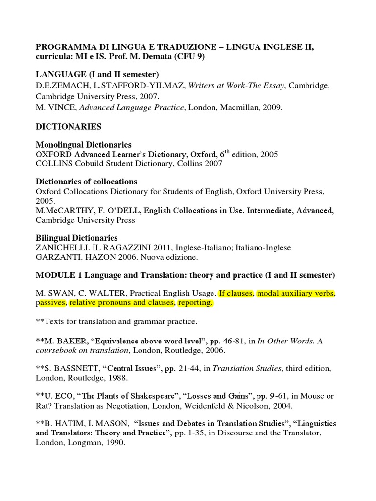 Programma Di Lingua E Traduzione Inglese Ii L12 Translations Dictionary