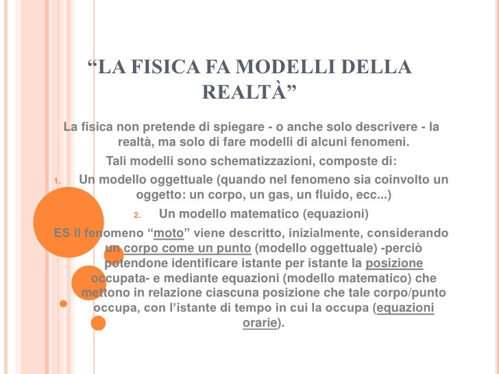 Metti alla prova le tue conoscenze di fisica. Concetti base della fisica 1 “LA FISICA FA MODELLI DELLA REALTÀ”La fisica non pretende di spiegare o anche solo descrivere la realtà, ma solo di fare modelli di alcuni fenomeniTali modelli sono schematizzazioni, composte diUn modello oggettuale (quando nel fenomeno sia coinvolto un oggetto un corpo, un gas, un fluido, ecc)Un modello matematico. E' SEVERAMENTE VIETATO LA RIPRODUZIONI DELLE MAPPE DI QUESTO SITO SU ALTRI BLOG, E UN EVENTUALE USO A SCOPO DI LUCRO dei contenuti presenti nel sito, è concesso l'uso ai fini scolastici e personali Come stabilito dalle norme sul diritto d'autore e sui diritti di proprietà intellettuale, Legge 22 aprile 1941 n 633.