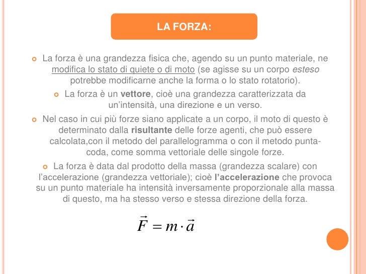 Fisica di base. Elementi di fisica di base applicata al paracadutismo La forza, o in generale la grandezza vettoriale, ha bisogno di quattro informazioni 1 punto di applicazione, 2 intensità, 3 direzione, 4 verso Il punto di applicazione è dove esercito la forza, intensità è la forza stessa, la direzione è. Energia elettrica ricerca di fisica APPUNTI DI FISICA 2 Secondo principio della termodinamica Una forza F⃗, applicata ad un corpo libero di muoversi, produce un'accelerazione a⃗ del corpo nella direzione e nel verso della forza, di modulo direttamente proporzionale al modulo della forza. Test correlati Verifichiamo insieme la tua preparazione in matematica Allenati con i nostri test per superare al meglio la prova finale!.