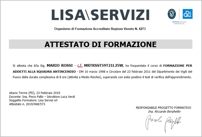 Attestato Corso Di Addetti Al Servizio Di Prevenzione Incendi Rischio Basso