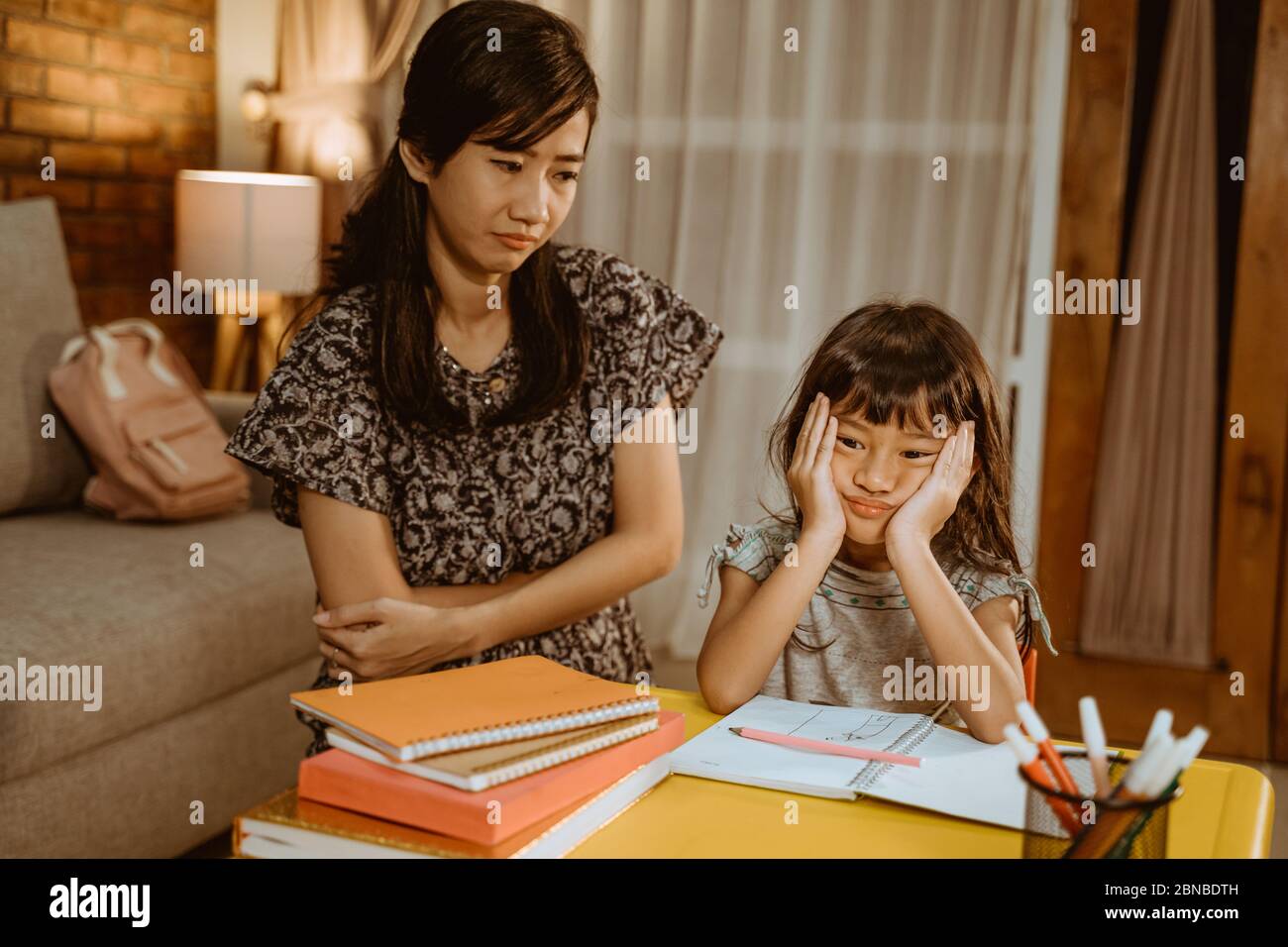 Bambino Stanco Che Fa I Compiti Alla Sera Con La Madre Foto Stock Alamy
