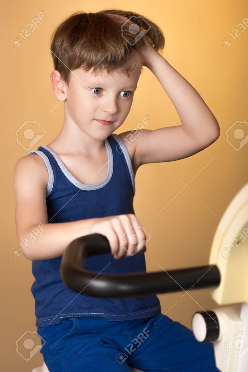 Immagini Stock Il Bambino E Addestrato Su Una Cyclette Conduce Una Vita Sana Il Ragazzo Si Sviluppa Muscoli Stanco E Sudato Generazione Sport Image