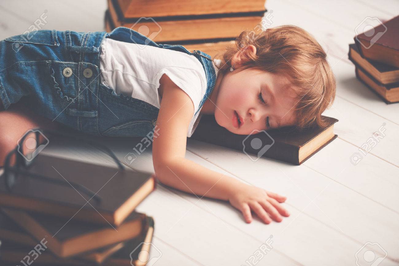 Immagini Stock Bambino Stanco Bambina Si Addormento Per I Libri Image