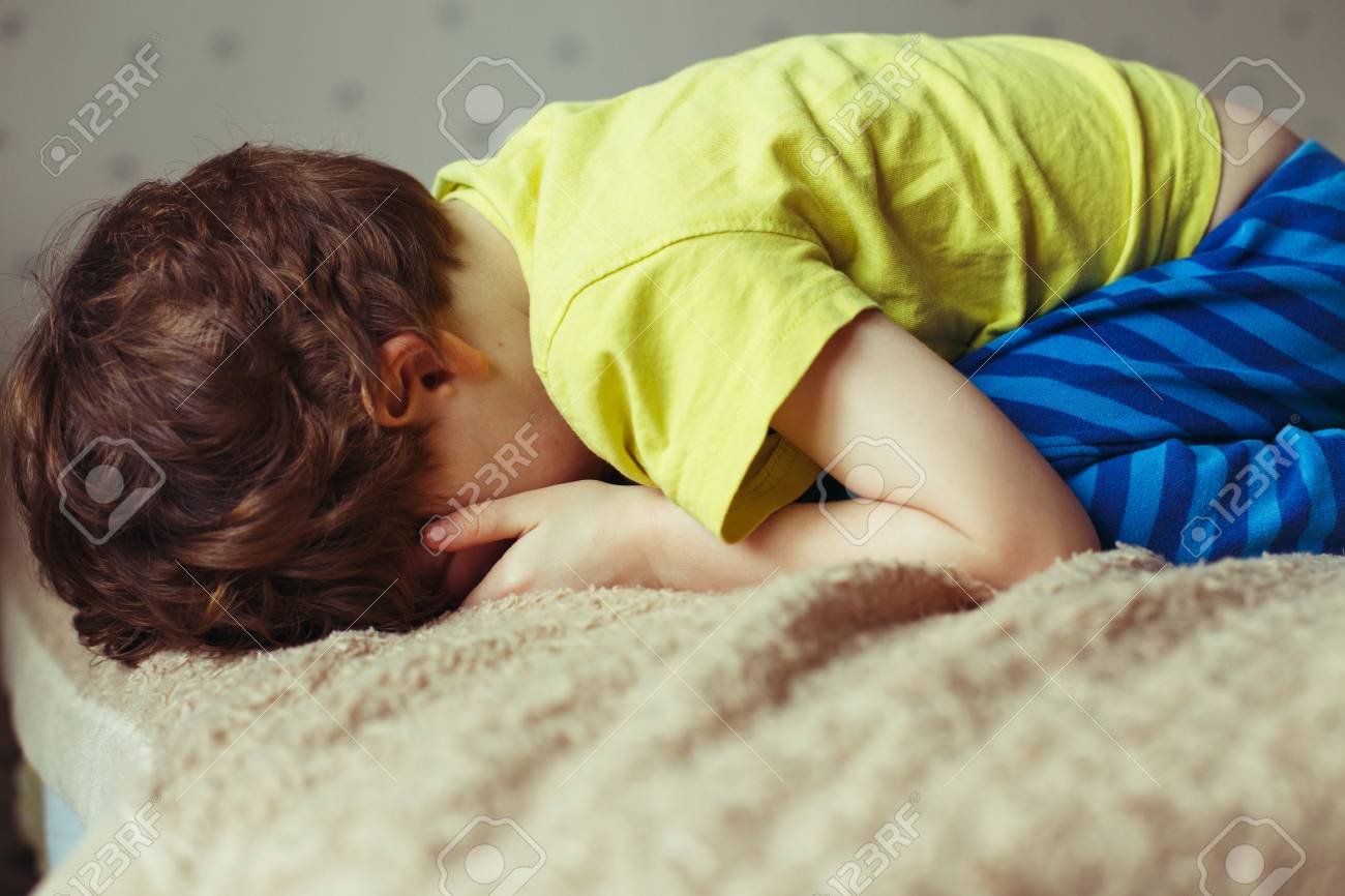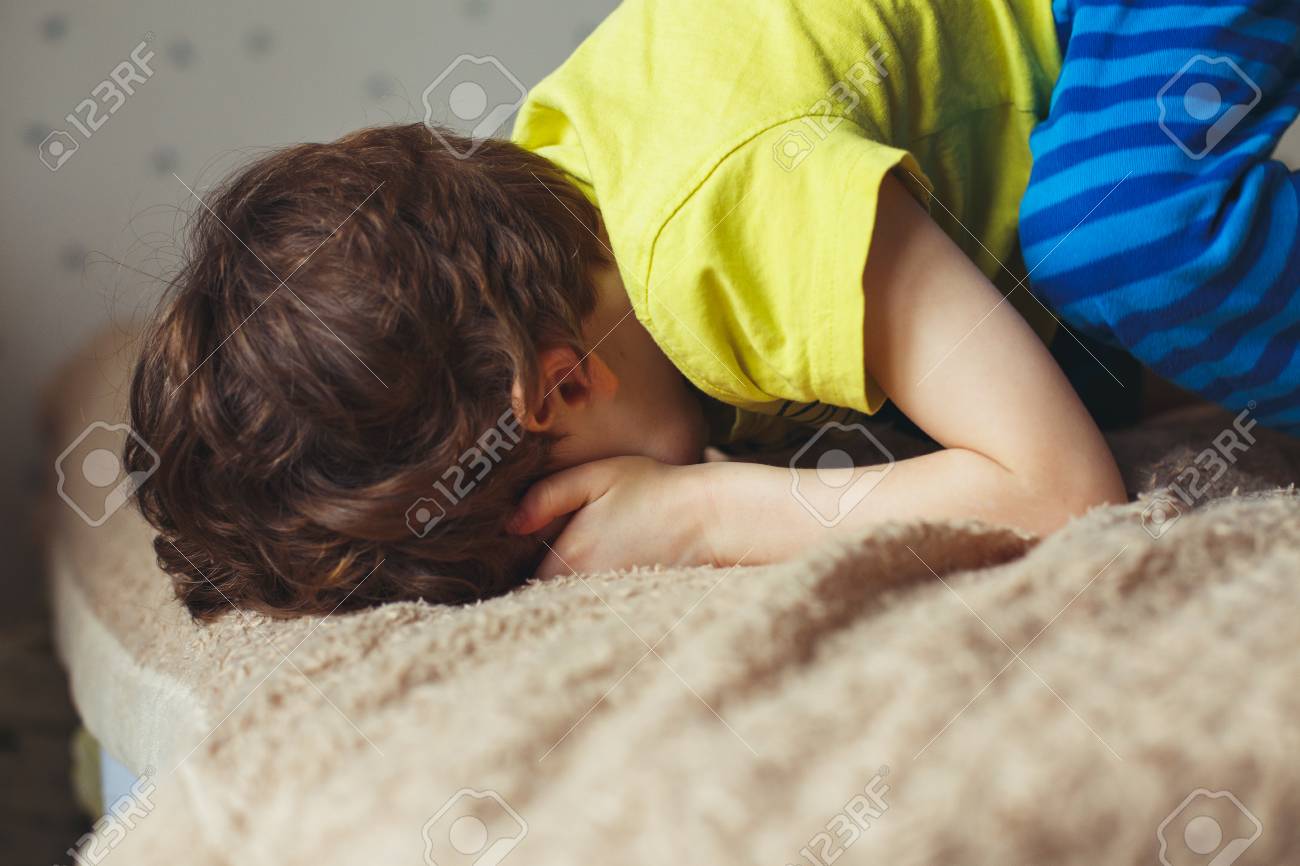 Immagini Stock Ragazzo Stanco Del Bambino Che Si Trova Sul Letto Con Il Suo Fronte Giu Piangere Ragazzino Image