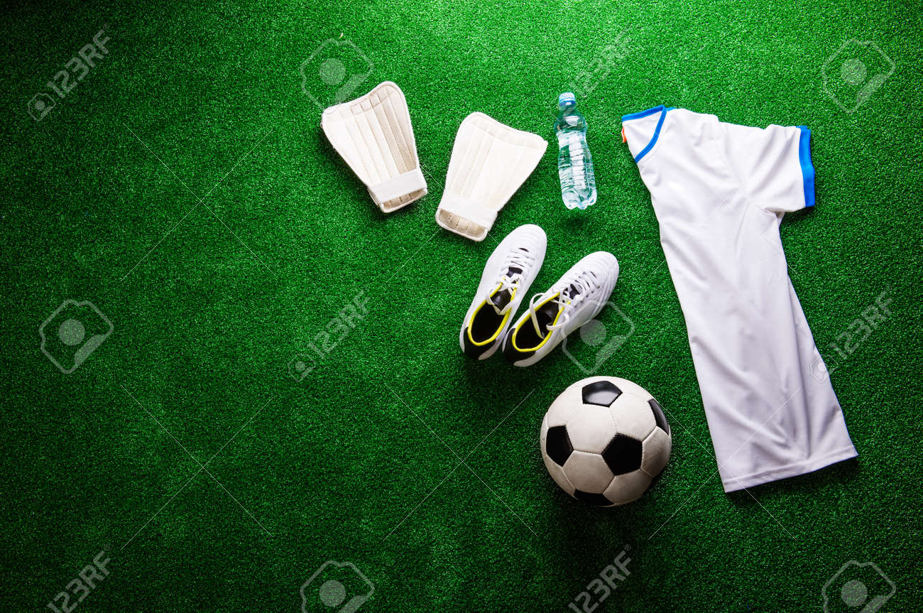 Immagini Stock Pallone Da Calcio Tacchetti E Varie Cose Da Calcio Contro Erba Sintetica Studio Sparato Su Priorita Bassa Verde Copia Spazio Image