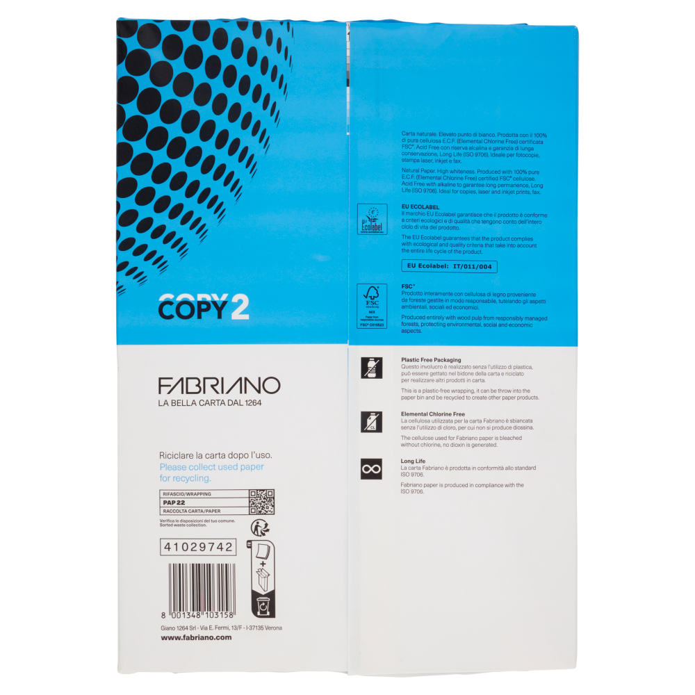 Carta per fotocopie di colore bianco da 80 g/mq con spessore 103 µm e punto di bianco cie 153 senza fori in 5 risme da 500 fogli Carta ad uso stampa dal peso di 80 g/mq di alta gamma, spessore 103 µm Carta di altissima qualità superficie naturale bianca, ideale per ogni utilizzo, con alto grado di bianco (cie 153). Codice UA10 Carte & cartoncini Carta per fotocopie Riciclata Steinbeis TREND WHITE, 80 grammi, formato (210x297mm), punto di Bianco 80 Disponibili 56 confezioni da 500 fogli, al , 0458 Verifica Prezzo per confezione da 500 fogli. La carta Fabriano Copy2 è una carta naturale con elevato punto di bianco Venduta in confezioni da 5 risme è prodotta con il 100% di cellulosa ECF (Elemental Chlorine Free), è Acid free con riserva alcalina e fornita di garanzia di lunga conservazione (ISO 9706).