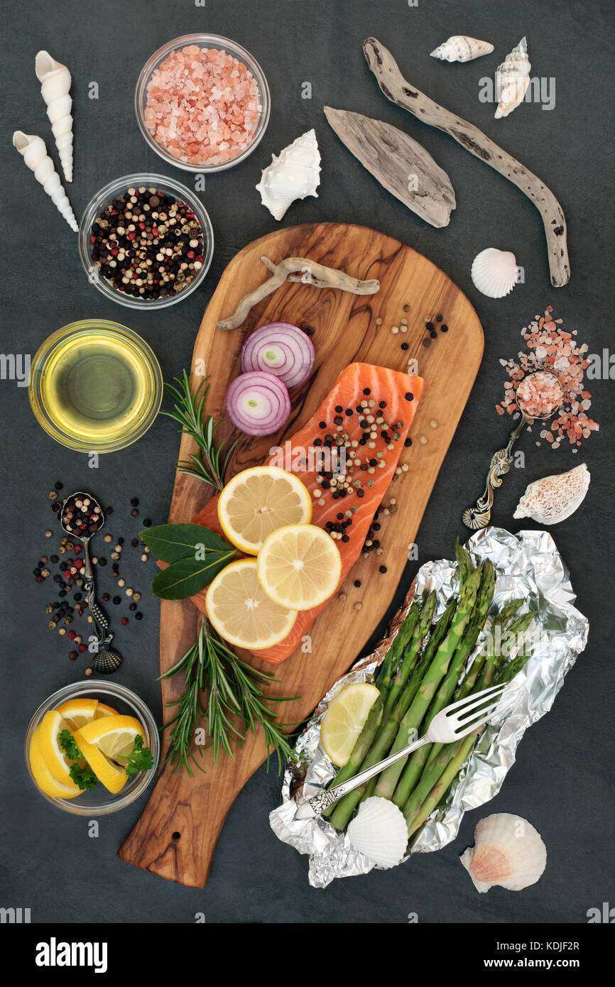 Cuore Sano Cibo Con Salmone Fresco Condimento Frutta Verdura E Olio D Oliva Su Una Tavola Di Legno Su Sfondo Di Ardesia Foto Stock Alamy