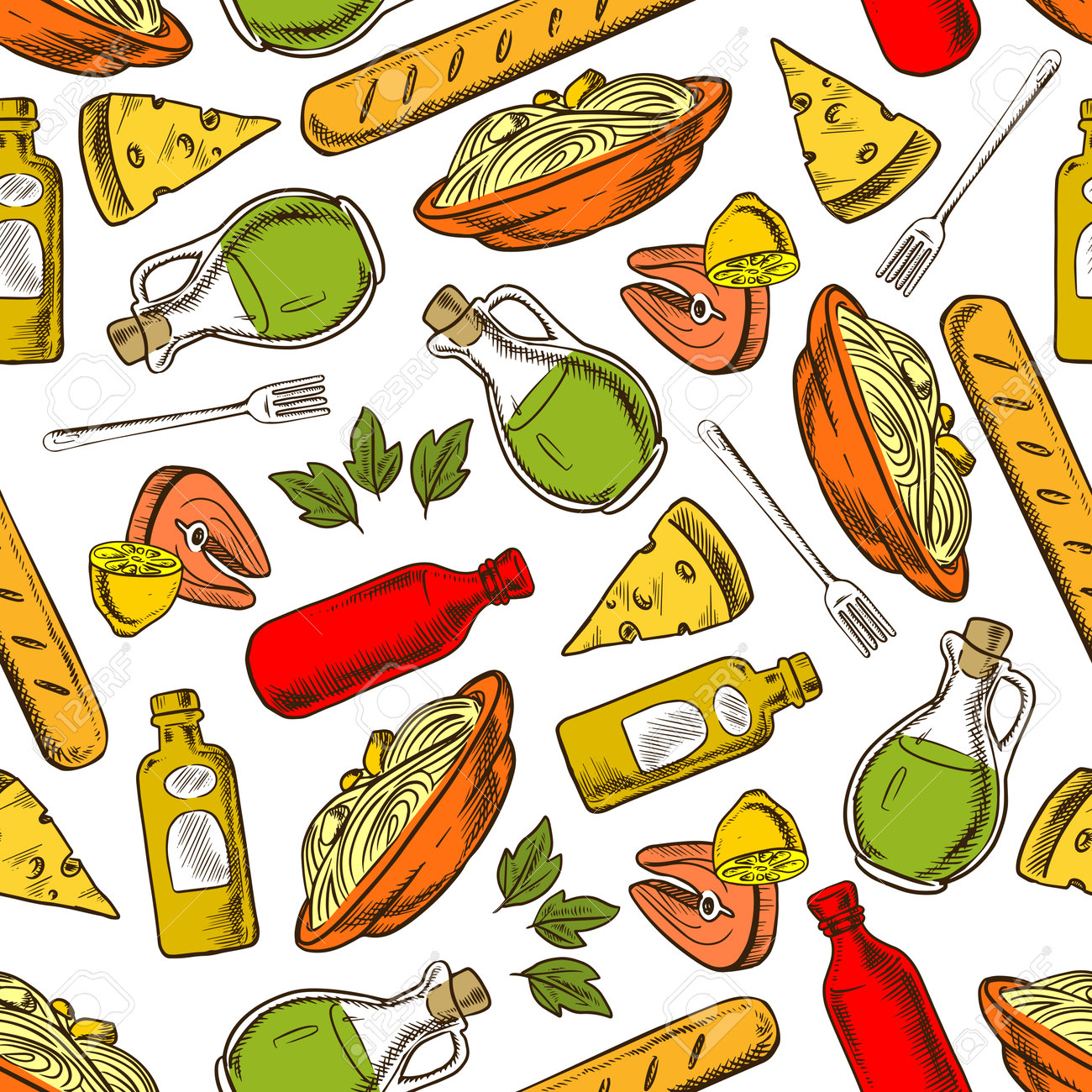 Vettoriale Senza Soluzione Di Continuita Italiano Sfondo Di Cibo Con Seamless Di Pasta Condito Con Foglie Di Basilico E Tranci Di Salmone Con Limone Bottiglie Di Olio D Oliva E Vino Rosso