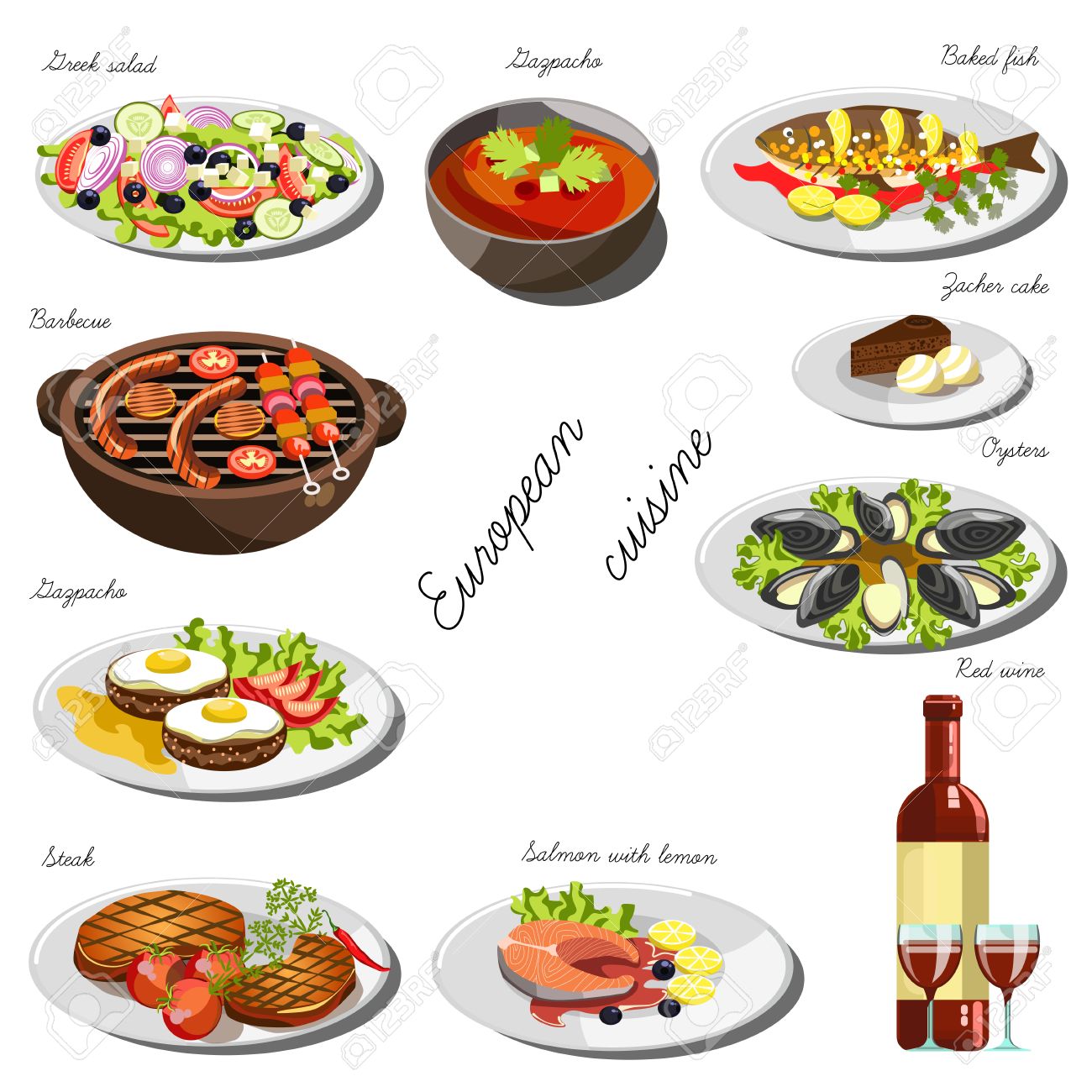 Vettoriale Set Cousine Europea Collezione Di Piatti Di Cibo Per La Decorazione Di Ristoranti Caffe Menu Illustrazione Vettoriale Isolati Su Bianco Image