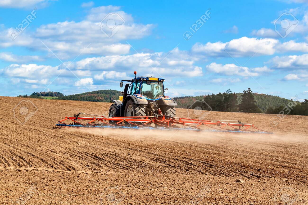 Blue Tractor Sows Grain Farm Work In The Czech Republic Tractor Stock Photo Picture And Royalty Free Image Image
