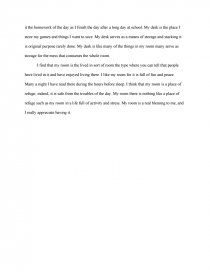 I love my room It has become my sanctuary to return to anytime I need comfort I can toss my shoes onto the floor and lie back on my soft cloud of a bed All the famous people look at me from the. An Essay on My Bedroom, My Kingdom PAGES 1 WORDS 402 View Full Essay About this essay More essays like this room, bedroom, nintendo Not sure what I'd do without @Kibin Alfredo Alvarez, student @ Miami University Exactly what I needed Jenna Kraig, student @ UCLA Wow Most helpful essay resource ever!. Descriptive Essay My Bedroom As I sit bundled up in a warm, brown, comfy hoodie and a big, pink blanket, I say to myself, “Where is my favorite place to be?” Well that’s easy, it’s here in my room My room is the one place I can be me.