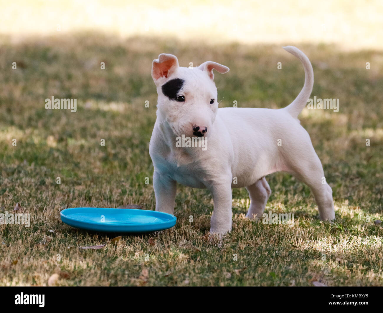 Portrait Of A Bull Terrier Puppy Posing On The Grass With A Toy Stock Photo Alamy