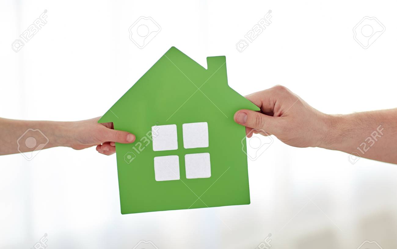 Immagini Stock Persone La Carita La Famiglia E Casa Concetto Vicino Di Figlio E Padre Mani Azienda Verde Casa Ritaglio Di Carta Image