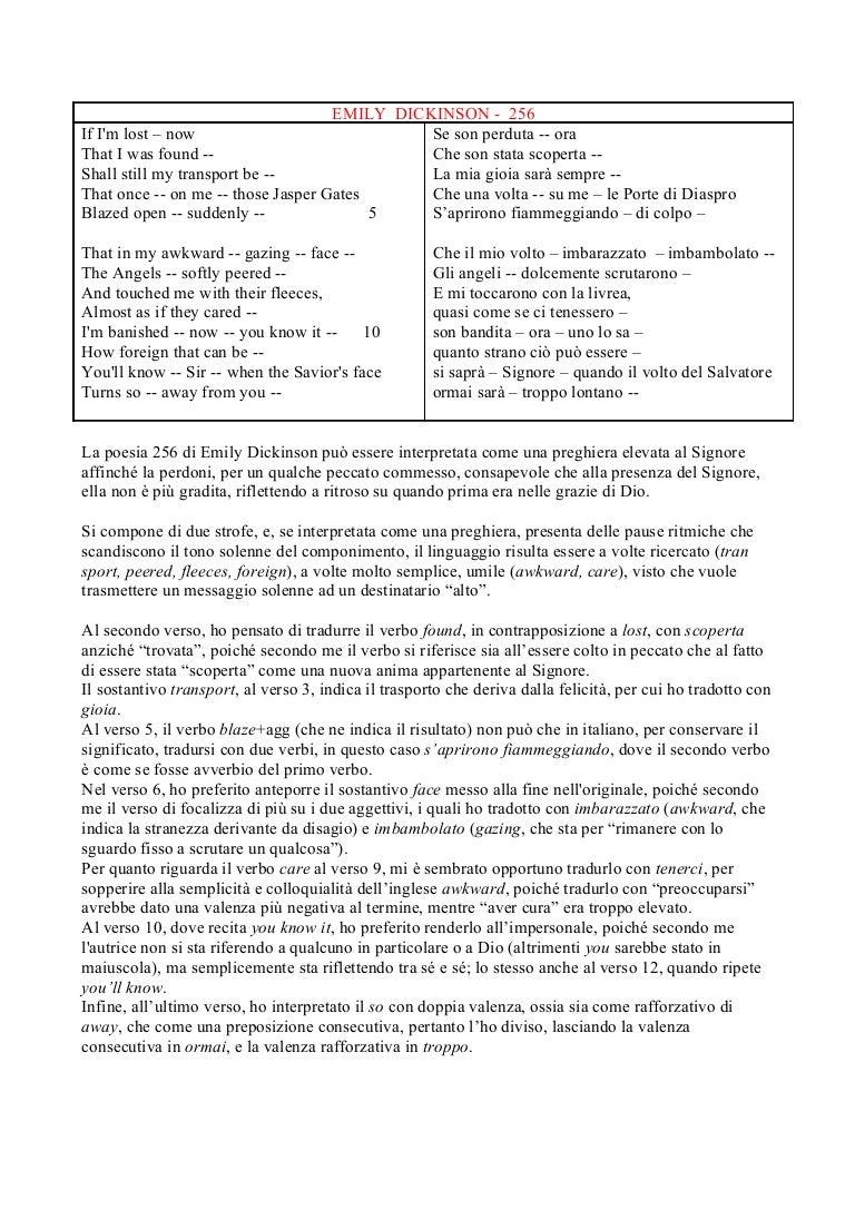 Nel dizionario italiano sanscrito puoi trovare frasi con traduzioni, esempi, pronuncia e immagini La traduzione è veloce e ti fa risparmiare tempo. (3) the voyages do not exceed thirty miles from the point of departure;. Traduzione Funeral Blues, 256 e The Consacrating Mother 1 EMILY DICKINSON 256 If I'm lost – now Se son perduta ora That I was found Che son stata scoperta Shall still my transport be La mia gioia sarà sempre That once on me those Jasper Gates Che una volta su me – le Porte di Diaspro Blazed open suddenly 5 S’aprirono fiammeggiando – di colpo – That.