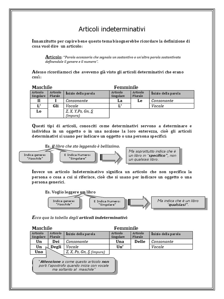 The Italian indefinite article ( l'articolo indeterminativo) corresponds to English a/an and is used with singular nouns It also corresponds to the number one INDEFINITE ARTICLES MASCHILE FEMMINILE uno zio (uncle) una zia (aunt) un cugino (cousin, m) una cugina (cousin, f). Articoli determinativi, indeterminativi e partitivi cominciamo dagli articoli determinativi Gli articoli determinativi indicano una persona, una cosa o un animale ben preciso e determinato La cartella di Carlo è rossa Nella frase ci si riferisce esattamente alla cartella di Carlo non a una cartella qualsiasi. The Italian indefinite article ( l'articolo indeterminativo) corresponds to English a/an and is used with singular nouns It also corresponds to the number one INDEFINITE ARTICLES MASCHILE FEMMINILE uno zio (uncle) una zia (aunt) un cugino (cousin, m) una cugina (cousin, f).