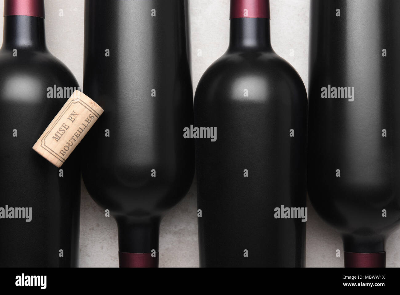Primo Piano Di Quattro Bottiglie Di Vino Rosso E Il Sughero Con Le Parole Francesi Mis En Bouteilles Traduzione In Inglese E Imbottigliato All Estate Foto Stock Alamy