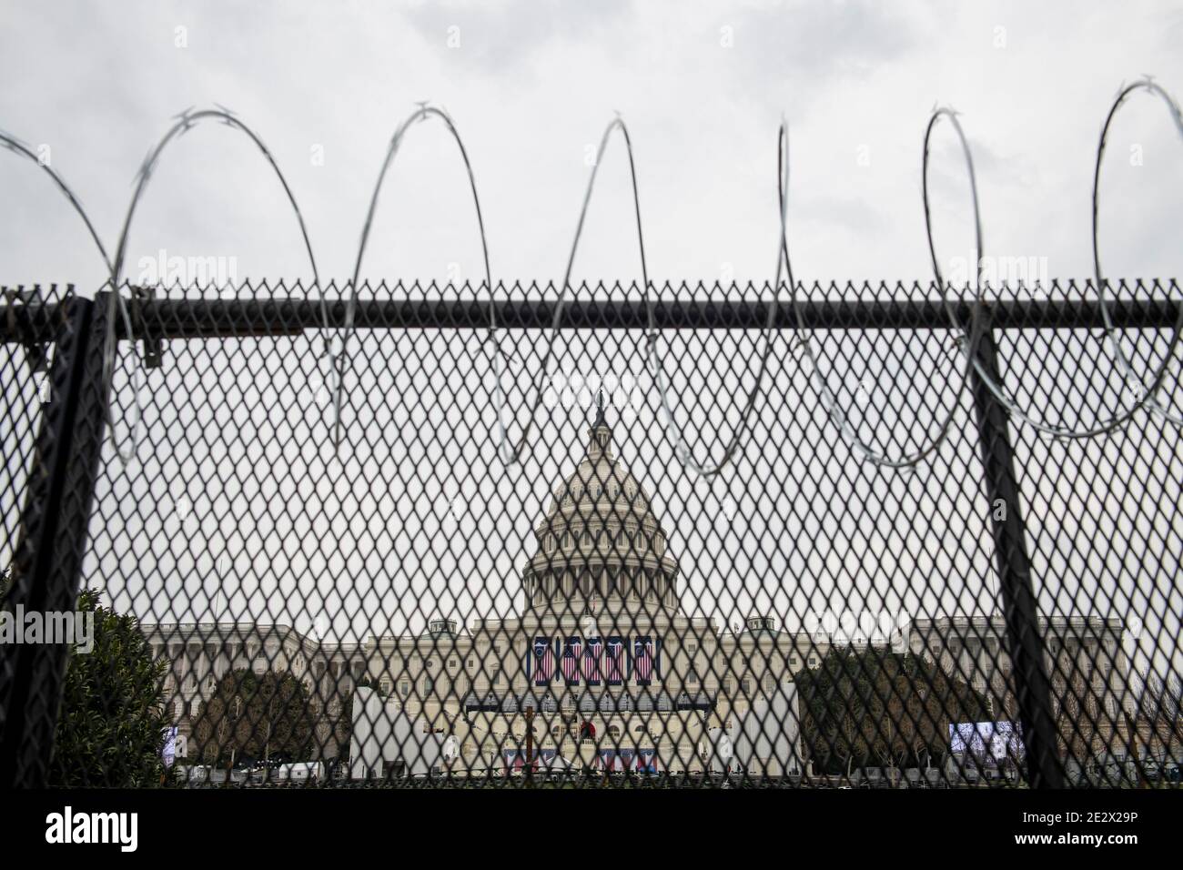 Workers installed razor wire atop 7foot fencing around the US Capitol on Friday as part of an unprecedented fortification effort ahead of next week’s inauguration of Presidentelect Joe Biden. National Guard helmets are placed on top of barricades as workers install razor wire to the top of fencing on Capitol Hill in Washington, Thursday, Jan 14, 21. COVID19 concerns, razor wire and no Trump An inauguration like no other Agence FrancePresse / 1018 AM January 18, 21 The US Capitol on January 17, 21 in Washington, DC.