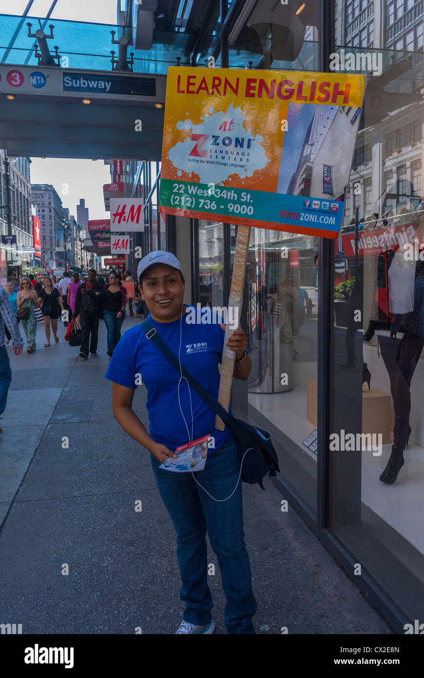 New York Ny Stati Uniti D America Dispari Di Persone Su Strada Donna Azienda Insegne Pubblicitarie Lezioni Di Inglese In Midtown Manhattan Annunci Commerciali Foto Stock Alamy