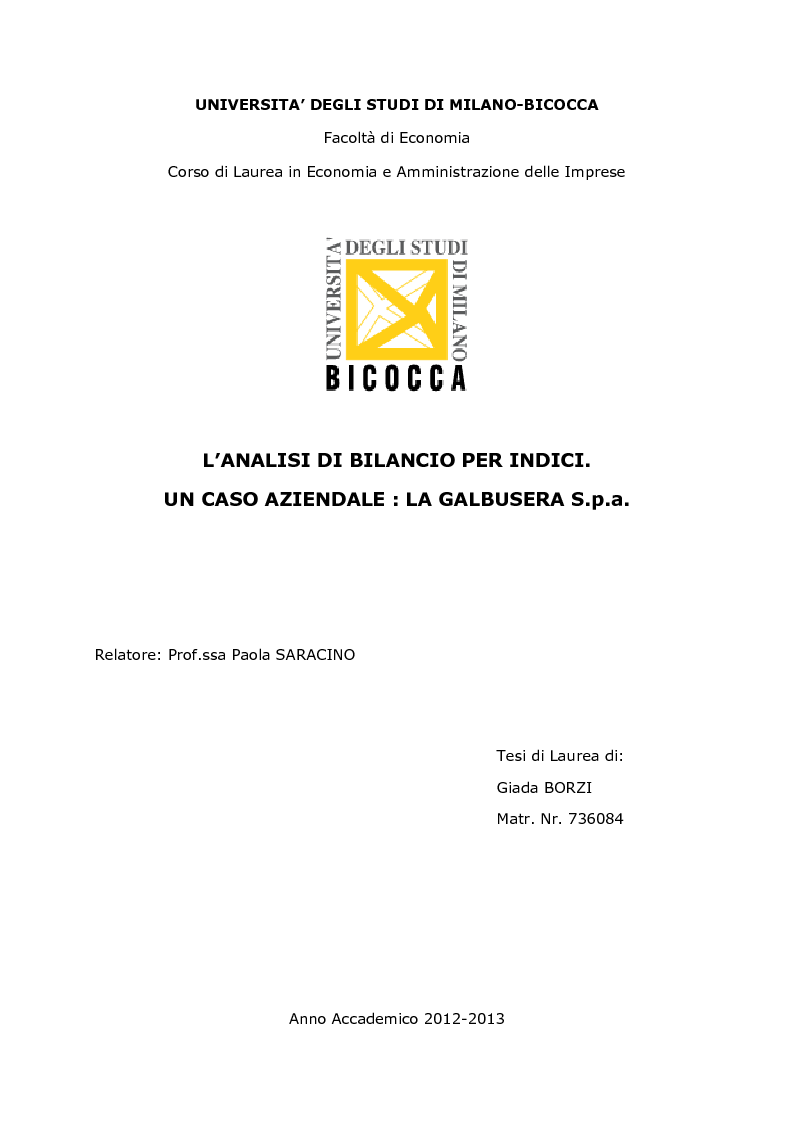 Universita Degli Studi Di Milano Bicocca Facolta Di Economia Corso Di Laurea In Economia E Amministrazione Delle Imprese L Analisi Di Bilancio Per Indici Tesionline