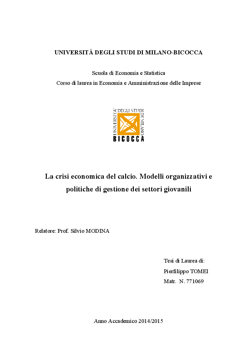 Universita Degli Studi Di Milano Bicocca Scuola Di Economia E Statistica Corso Di Laurea In Economia E Amministrazione Delle Imprese La Crisi Economica Del Calcio Tesionline