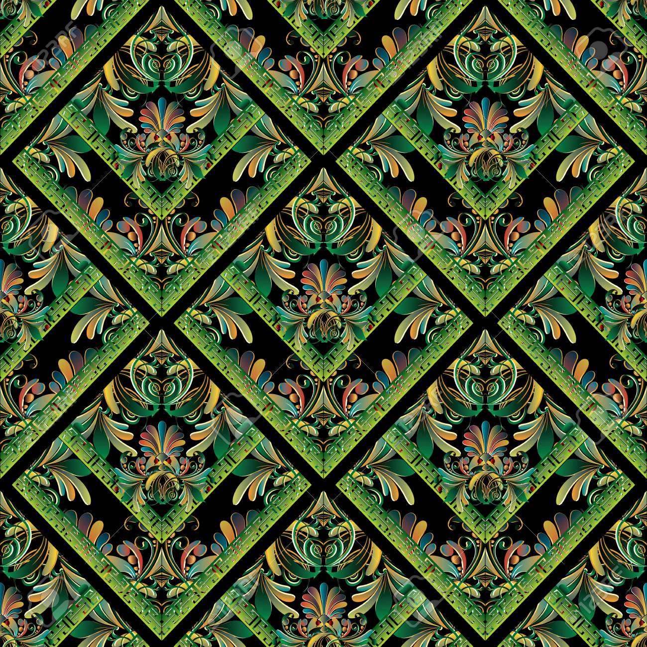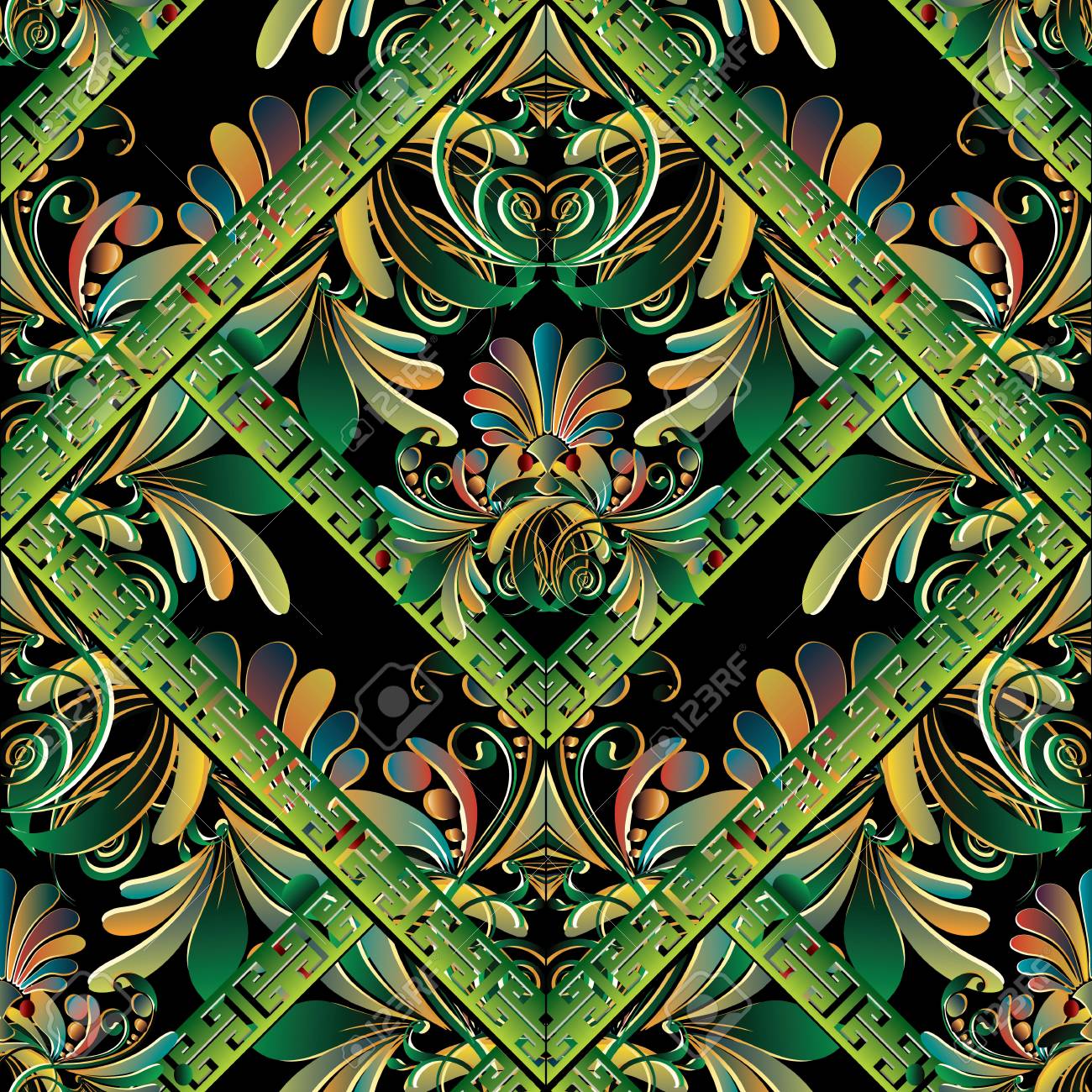 Immagini Stock Motivo Floreale Senza Soluzione Di Continuita La Chiave Greca Di Vettore Serpeggia Il Fondo Progettazione Di Sfondi Decorati Ornamenti Floreali Colorati Trafori Fiori 3d Luminosi Foglie Cornici Meandri Verdi